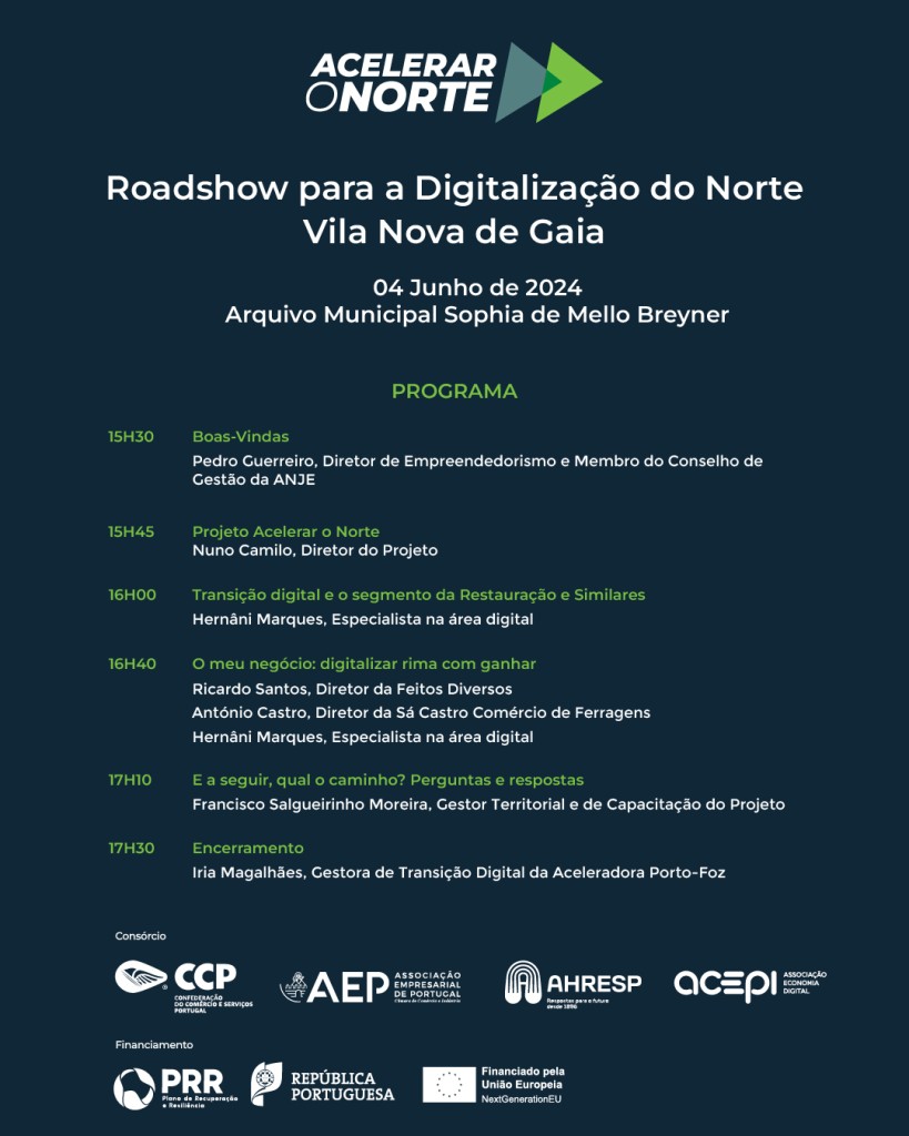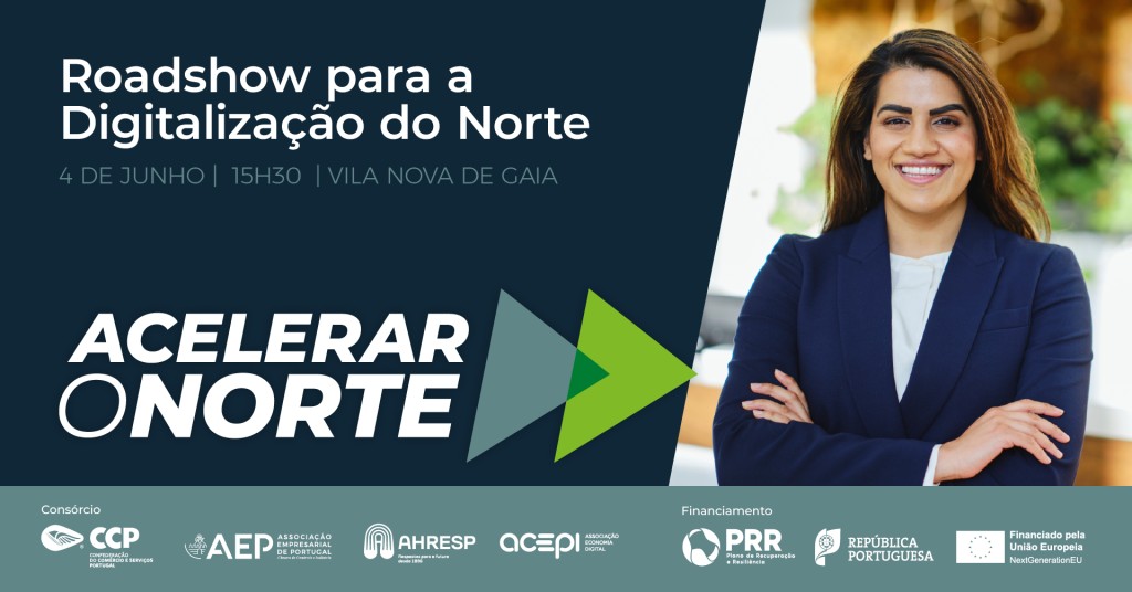 No dia 4 de junho, a CCP, a AEP, a AHRESP e a ACEPI apresentam, em Vila Nova de Gaia, em parceria com a Associação Nacional de Jovens Empresários, o projeto ACELERAR O NORTE, uma iniciativa que apoia a transição digital das micro, pequenas e médias empresas do Norte de Portugal dos setores do comércio, serviços pessoais e da restauração e similares.
