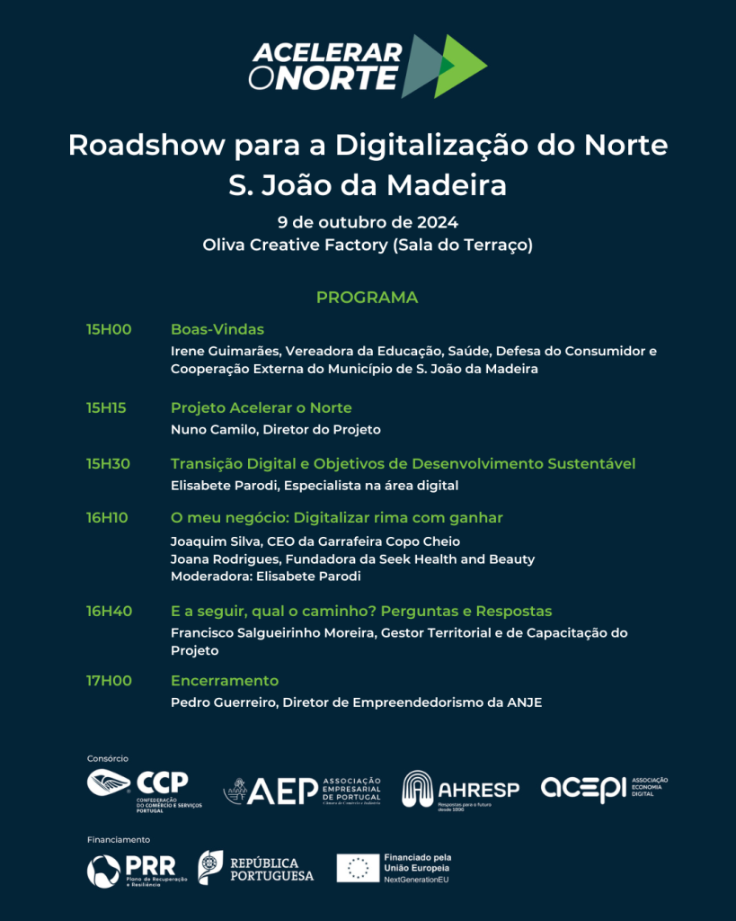 A CCP, a AEP, a AHRESP e a ACEPI, em parceria com a ANJE – Associação Nacional de Jovens Empresários, e com o apoio local da Câmara Municipal de São João da madeira apresentam o Roadshow para a Digitalização do Norte, um conjunto de encontros que pretendem dar a conhecer aos empresários do comércio, dos serviços pessoais e da restauração e similares o projeto ACELERAR O NORTE e os apoios à transição digital no âmbito desta iniciativa.
